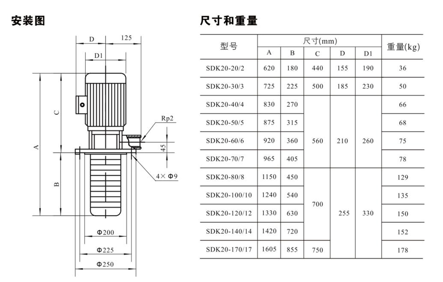 SDK20/SDKT20為配用標(biāo)準(zhǔn)電機(jī)的非自吸立式多級離心泵,電機(jī)軸和泵軸用聯(lián)軸器直接聯(lián)接的結(jié)構(gòu)。為滿足水槽或容器的安裝深度,可安裝空套的腔體來改變泵本身的侵入 深度。